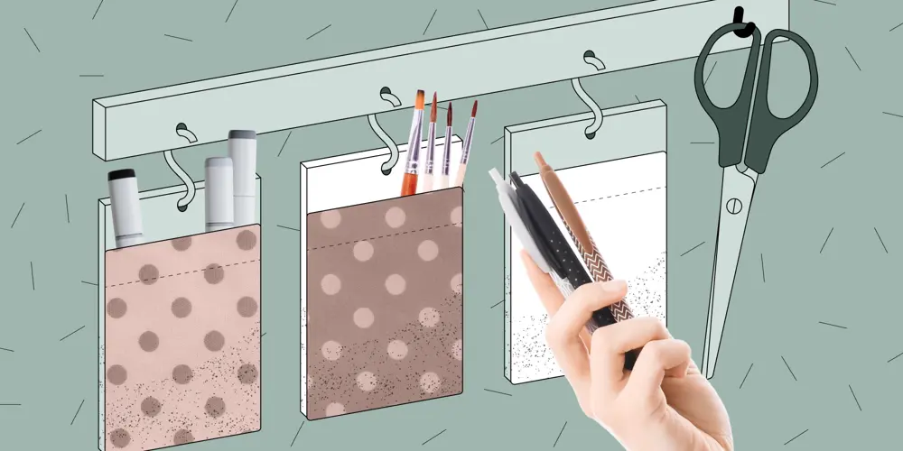 Шуруповёртом прикрепите к брусу крючок — на него можно будет вешать ножницы. В отверстия проденьте съёмные крючки и повесьте на них доски с кармашками.